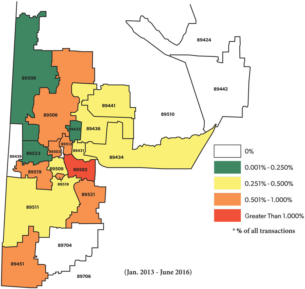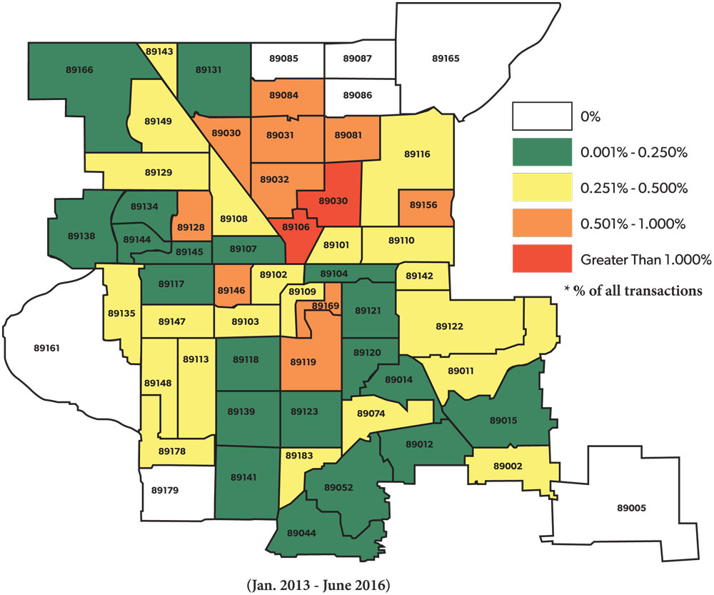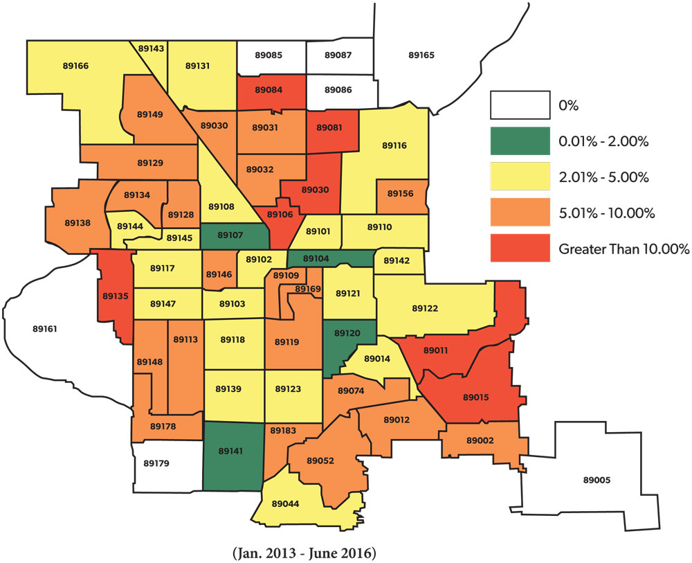 The LIED Institute calculated a “foreclosure discount,” which estimates the total value lost in the housing market. Assessor data shows that the average sale price of an HOA foreclosure is $112,545. If each foreclosure was subject to a 42% discount, the “normal” sale price would have been $194,043. Therefore, across all 611 properties in Clark County, LIED estimates that the total loss to sellers is $49,795,341. As seen in the map below, the overall rate of HOA foreclosures is somewhat concentrated in the central and north central parts of the Las Vegas metro area. The zip codes in the outer ring of suburbs exhibit correspondingly less foreclosures.*