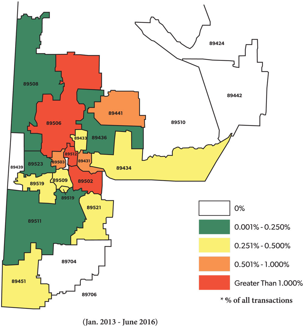 The LIED Institute for Real Estate Studies at UNLV found that the average house transaction was potentially affected by 0.39 HOA foreclosures and roughly 4.4 “regular” foreclosures. There were 109,692 arms-length transactions from January 1st, 2013 through June 30th, 2016. In all, 611 HOA foreclosures were recorded in Clark County during this period, and 71 in Washoe County.
